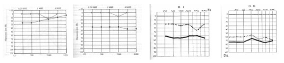 • PROGRESION LENTA.1) HIPOACUSIA DE TRANSMISION CON UMBRAL DE 20-40 Dbs, PEOR EN FRECUENCIAS GRAVES.